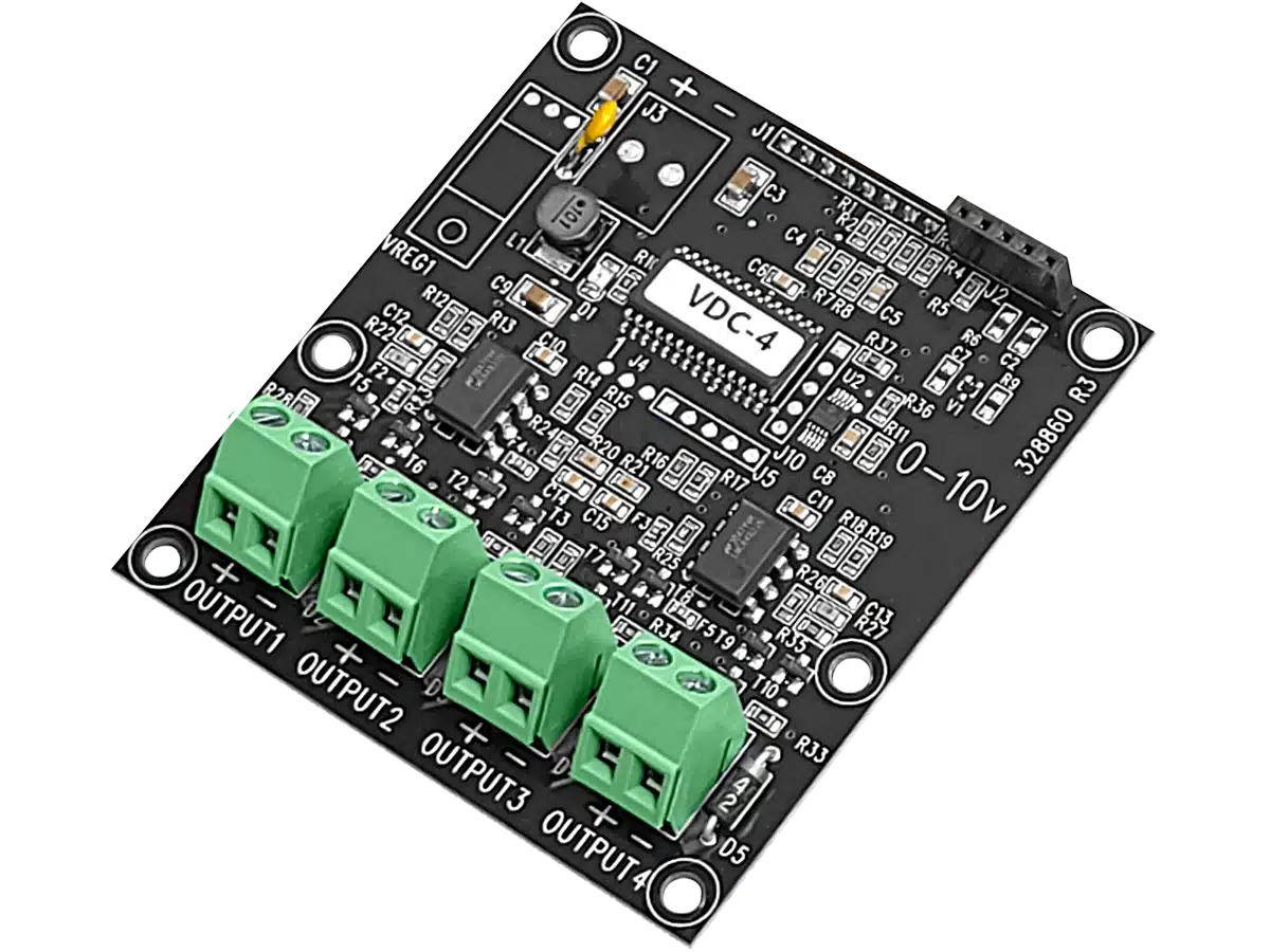 The VDC-4 has four outputs for controlling variable frequency drives (VFD), FanDRIVEs, or other equipment requiring a 0 to 10 V DC signal. The VDC-4 features a built-in microprocessor that precisely controls equipment while also providing safety protection.